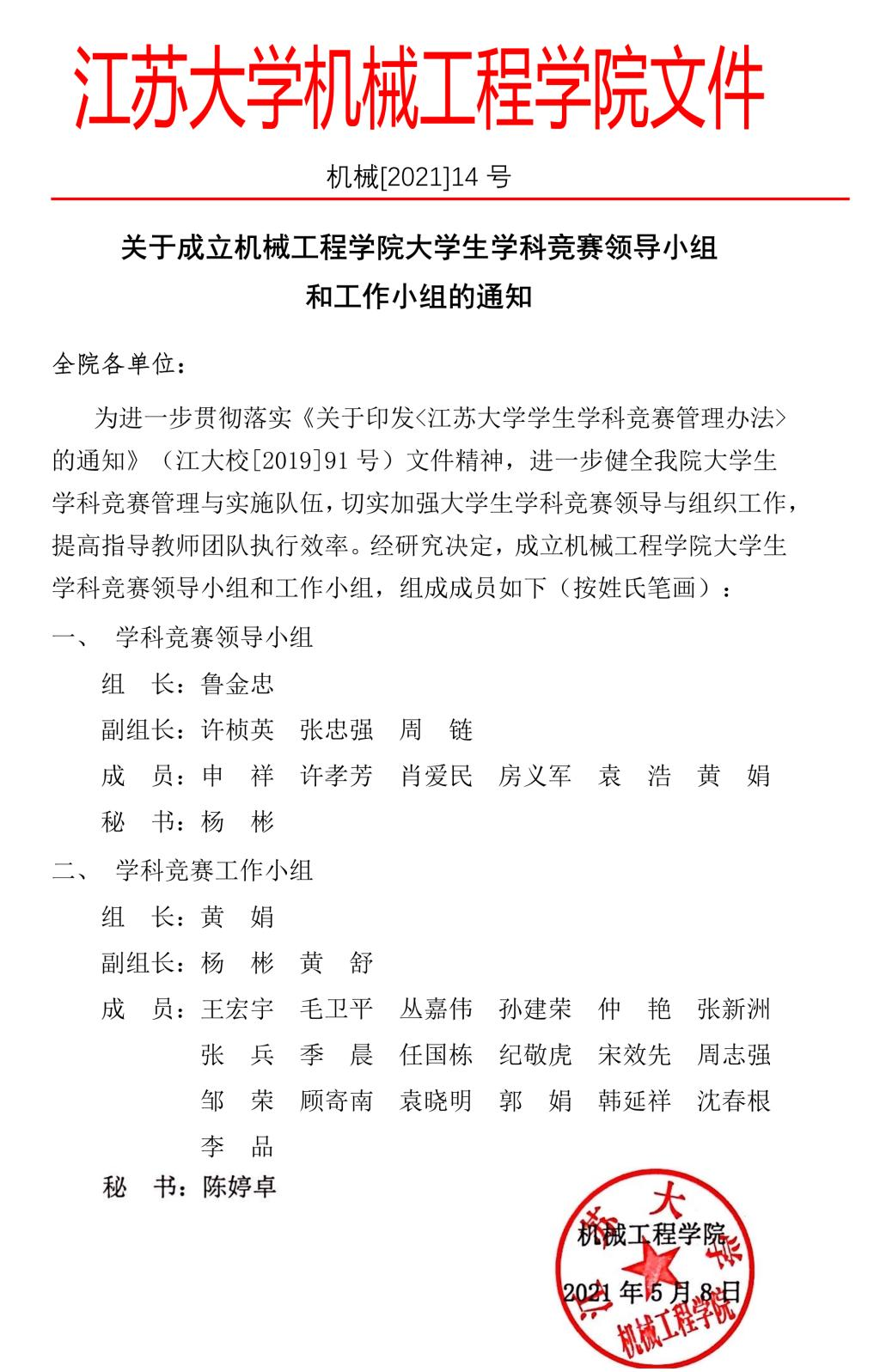 关于成立hg8088皇冠登录入口大学生学科竞赛领导小组和工作小组的通知(机械[2021]14号)