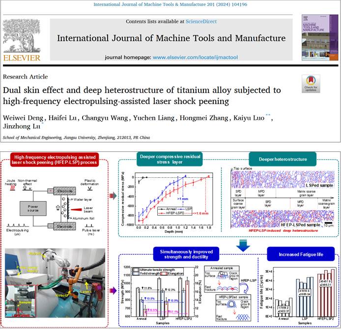 近日,我校hg8088皇冠登录入口鲁金忠教授团队在机械制造领域顶刊《International Journal of Machine Tools and Manufacture》(国际机床与制造杂志)上发表了题为“Dual skin effect and deep heterostructure of titanium alloy subjected to high-frequency electropulsing-assisted laser shock peening”的研究论文。该研究成果提出了一种新型高频电脉冲辅助激光冲击深度强化技术(HFEP-LSP),其在Ti6Al4V合金表层诱导双“趋肤效应”,残余压应力层深度从>1000 μm增加到>1600 μm,与LSP相比残余压应力深度提高了60%,塑性变形层深度提高了83.3%;与Ti6Al4V原始试样相比,极限抗拉强度、屈服强度和延伸率分别提高了12.3%、13.9%和57.1%,疲劳寿命增加到49497.8±2406.31次循环,提升了176.4%,实现强韧性的协同提升和疲劳寿命的大幅度增长。hg8088皇冠登录入口博士生邓维维为第一作者,鲁金忠教授和罗开玉教授为共同通讯作者。