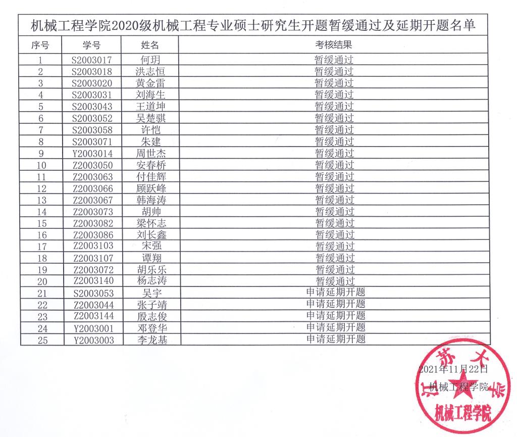 根据《hg1088皇冠welcome研究生学位论文选题与开题的要求及考核办法》文件,经专家组考核,2020级机械工程专业研究生开题暂缓通过名单及经个人申请,学院审核延期开题名单公示如下。仪器学科、光学工程学科的开题暂缓通过名单待两学科开题考核结束后,另行公示。