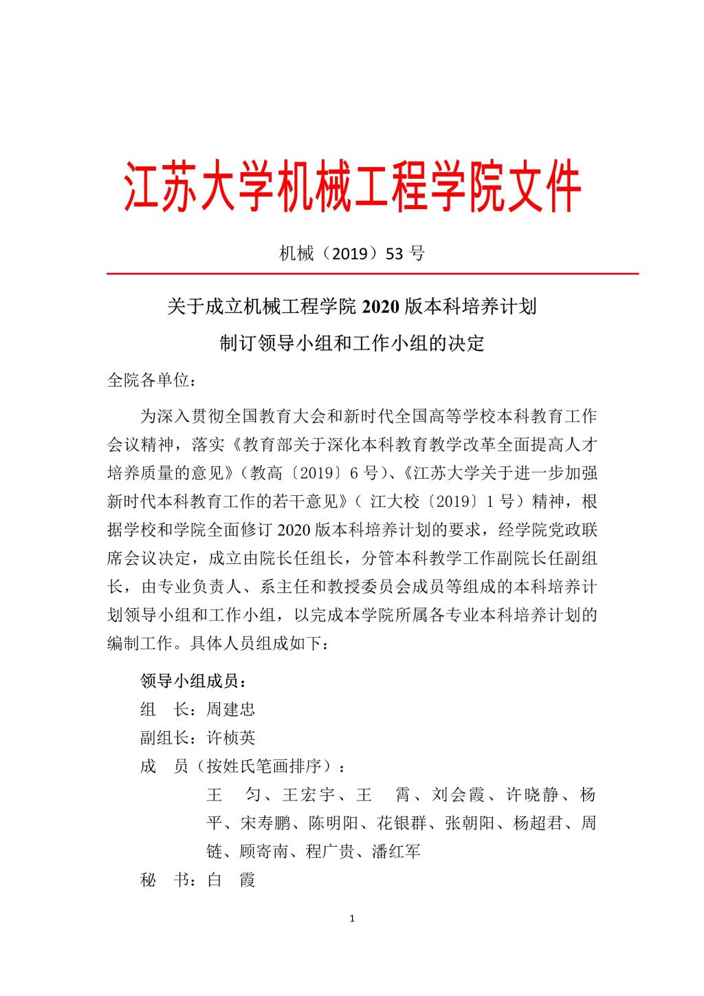 【机械〔2019〕53号】关于成立hg8088皇冠登录入口2020版本科培养计划制订领导小组和工作小组的决定.docx