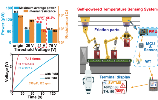 本工作创新提出了一种适用于高输出电压TVNG的电源管理策略,通过耐高压二极管的引入有效抑制了从过渡电容到TVNG的能量回流,将最大功率点跟踪算法(MPPT)和降压转换器结合设计了自主电源管理单元(PMU)。实验结果显示,PMU实现了对TVNG电输出的有效调控,PMU管理后TVNG与管理前相比内部阻抗降低10倍,电容的充电速度提高7.18倍,可实现对100LED6个并联温湿度计持续供能。这项工作为高输出电压TVNG提供了一种有效的电源管理策略,将进一步推动TVNG在自供能传感系统和工业物联网(IIoT)领域的应用。