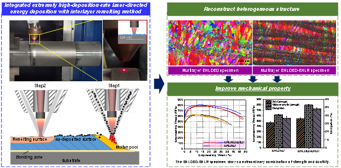 近日,我校hg8088皇冠登录入口鲁金忠教授、罗开玉教授团队研究开发了一种新型超高速激光复合增材制造技术(EHLDED-EHLR),显著促进了凝固过程中状晶向等轴晶的转变,形成了以超细等轴晶主导的空间异质结构,材料强韧性实现同步提高。相关研究成果以“High-performance functional coatings manufactured by integrated extremely high-speed-rate laser directed energy deposition with interlayer remelting”为题发表在机械制造领域顶刊International Journal of Machine Tools and Manufacture(国际机床与制造杂志,IF=14)上。